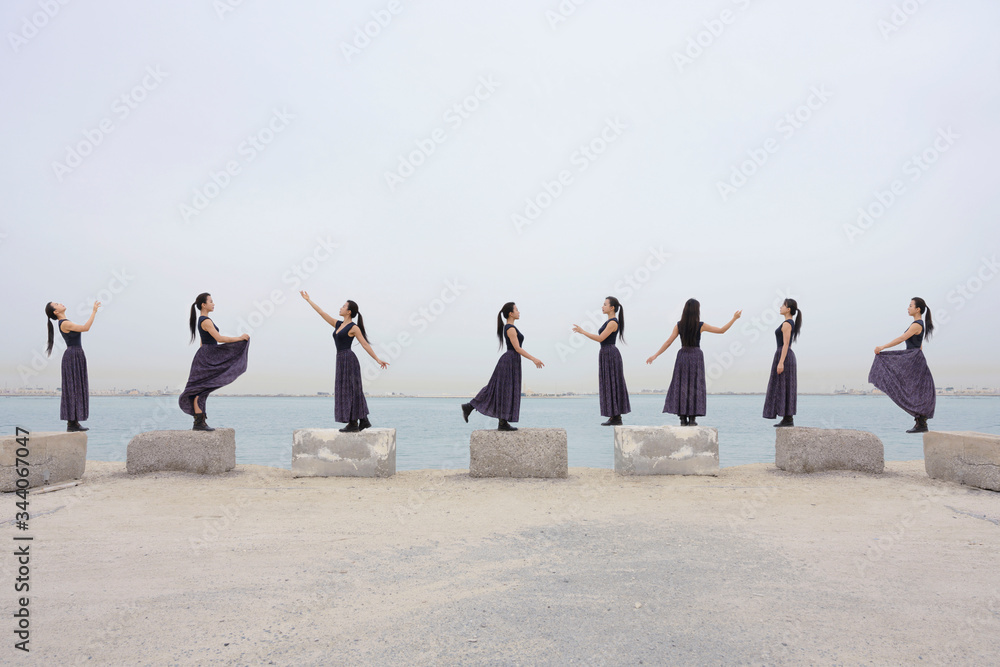Samolepka Same woman cloning standing on the bricks posing on the beach over white sky background