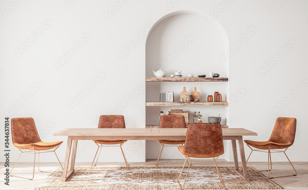 Samolepka Interior design of modern dining room with orange furniture and wooden table, Sc