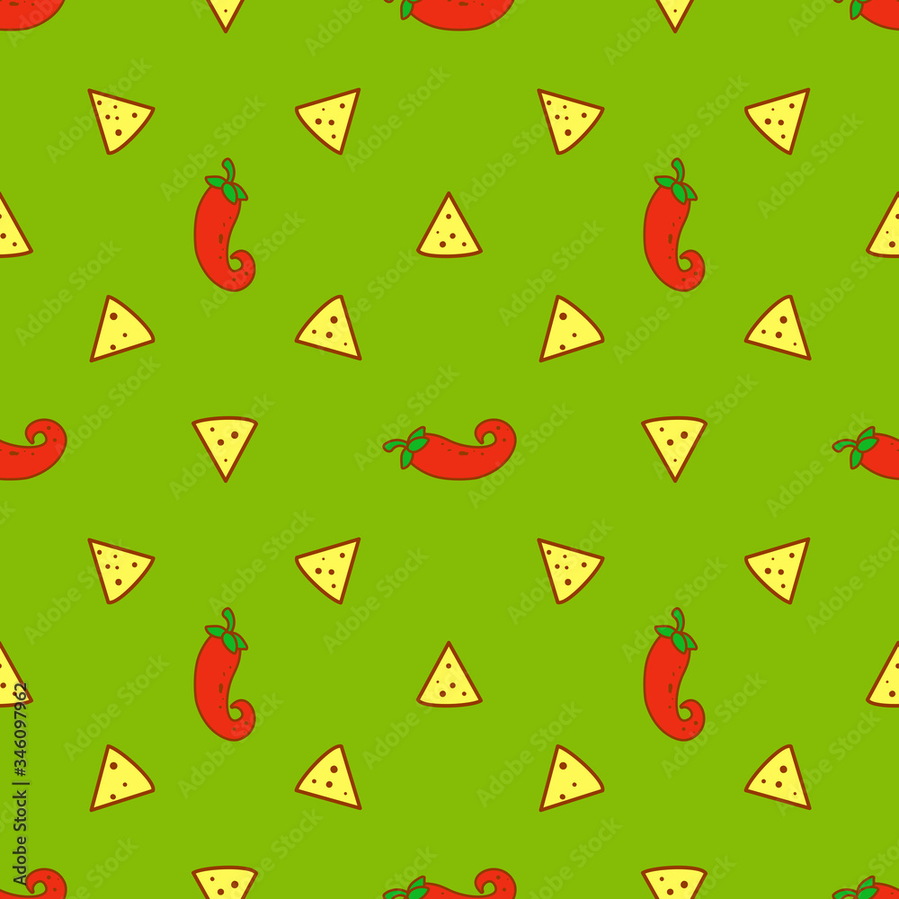 Samolepka Seamless pattern with nacho chips and chili peppers on green guacamole background