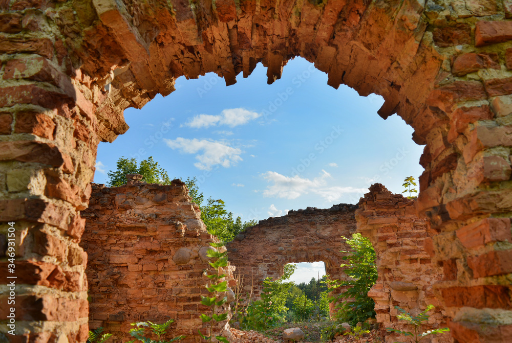 Samolepka view of the blue sky through the ruined arch of a ruined castle overgrown with g
