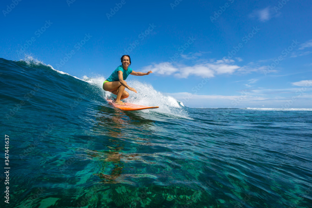 Samolepka beautiful girl surfing on big transparent waves
