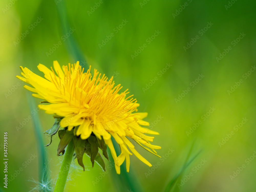Samolepka Yellow sow-thistle flower in a green grass meadow, yellow dandelion on green bac