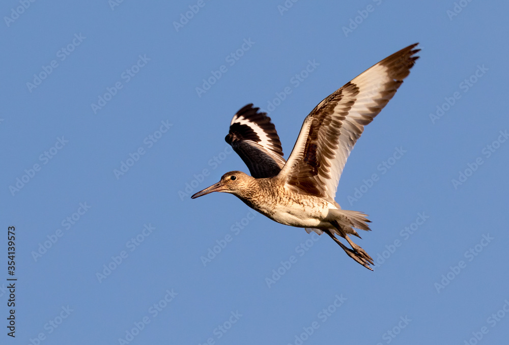 Samolepka Willet (Tringa semipalmata) flying in blue sky, Galveston, Texas, USA