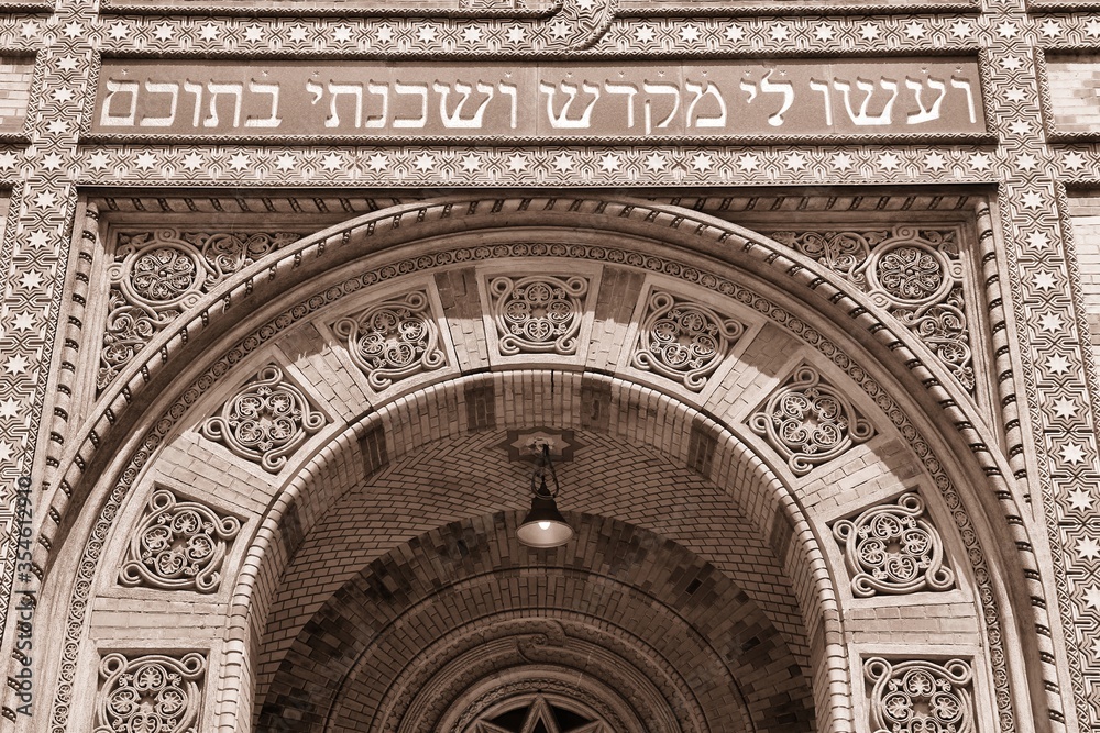Samolepka Synagogue in Budapest. Sepia toned retro filter photo.
