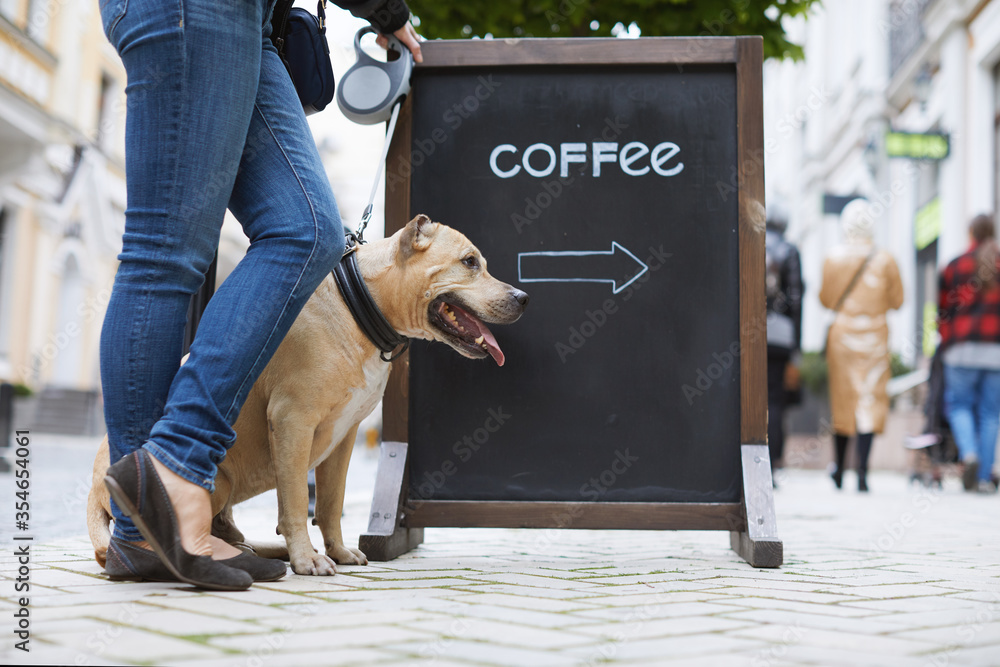 Samolepka Woman with a dog stand next to a billboard with the inscription coffee on the street in city