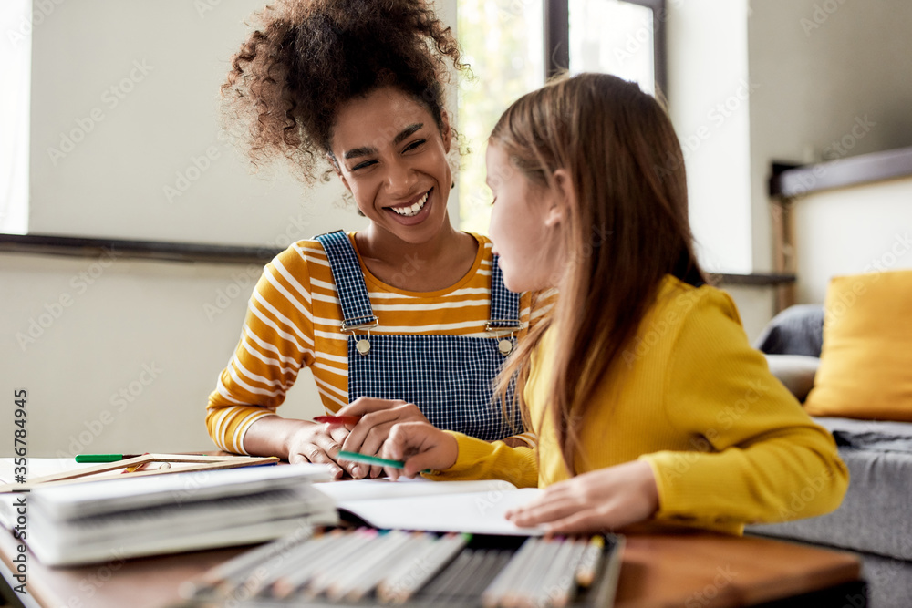 Samolepka Caucasian little girl spending time with african american baby sitter
