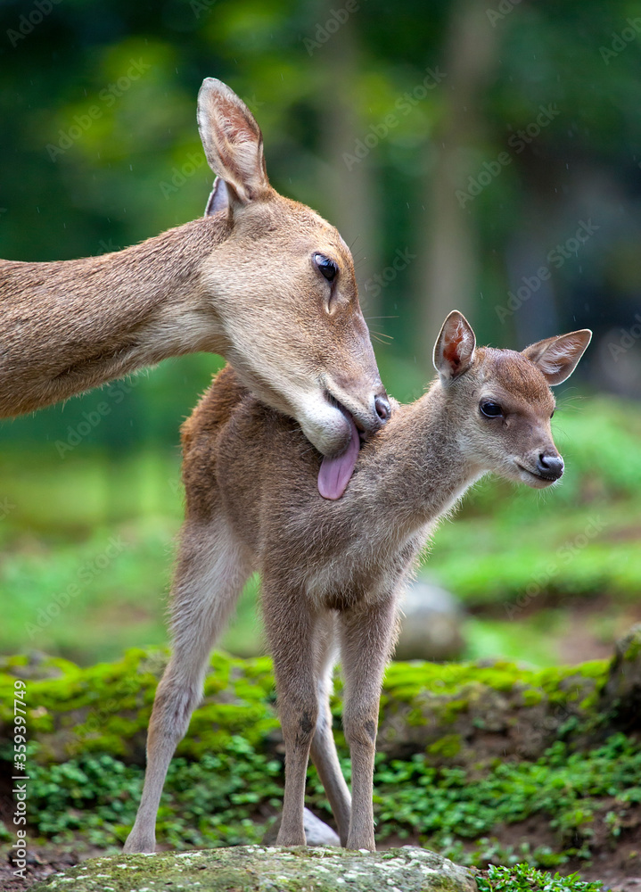 Samolepka A mother deer caring for it's young fawn.