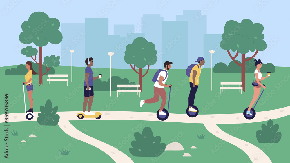 Samolepka People riding eco transport in city park vector illustration