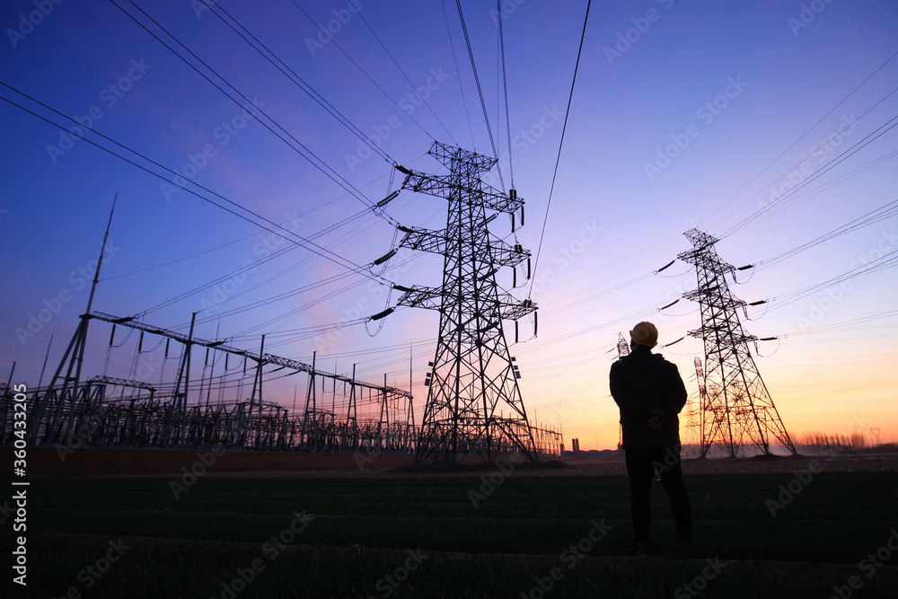 Samolepka Electricity workers and pylon silhouette, Power workers at work