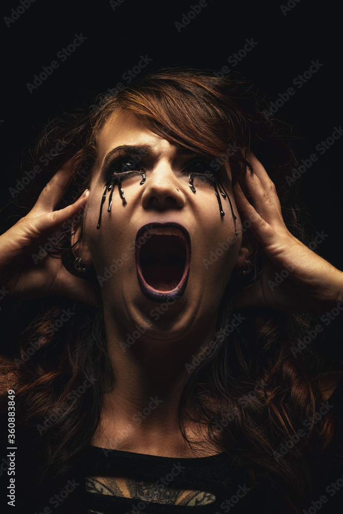Samolepka Portrait of a possessed woman, bloody eyes, face expressing suffering and madnes