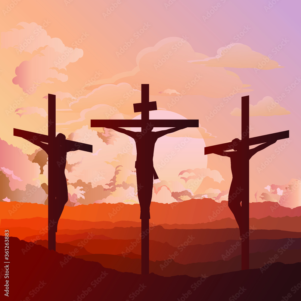 Samolepka Silhouetted depiction of the crucifixion of Christ and two thieves collectively