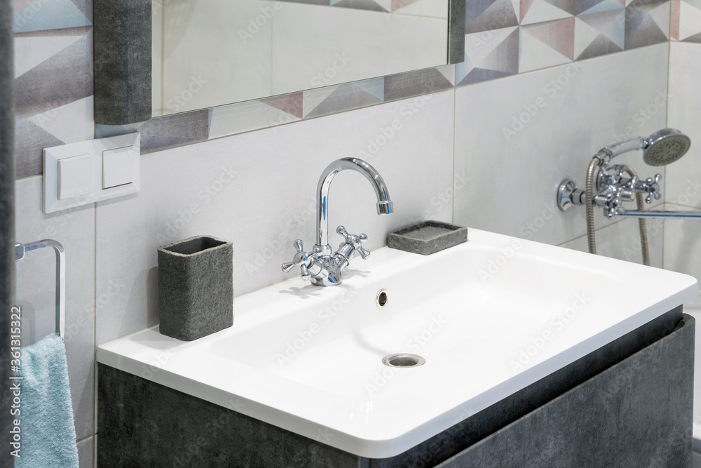 Samolepka Modern bathroom interior with metal faucet and ceramic white sink