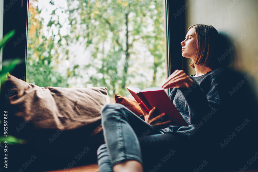 Samolepka Thoughtful young woman looking out of window pondering on idea and plot of new bestseller of favourite author resting on comfortable windowsill in stylish coworking space