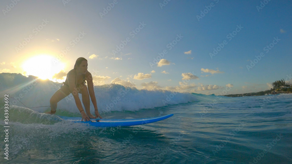 Samolepka SUN FLARE: Woman learning to surf stands up on her longboard and rides a wave