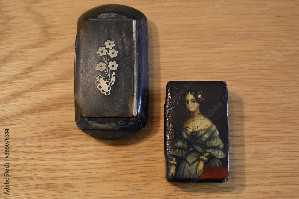 Samolepka Ornate boxes produced in pocket size or larger communal for table use to keep the precious snuff dry