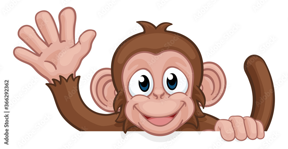 Samolepka A monkey cartoon character animal peeking over a sign and waving