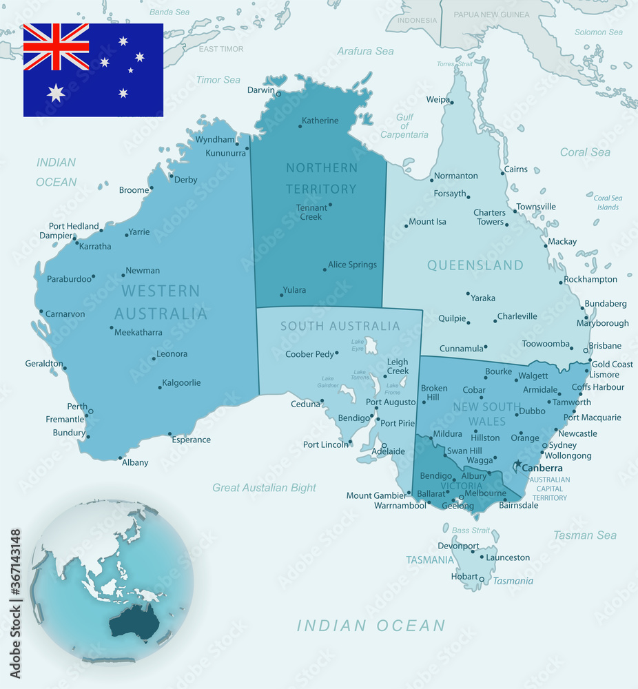 Samolepka Blue-green detailed map of Australia and administrative divisions with country flag and location on the globe