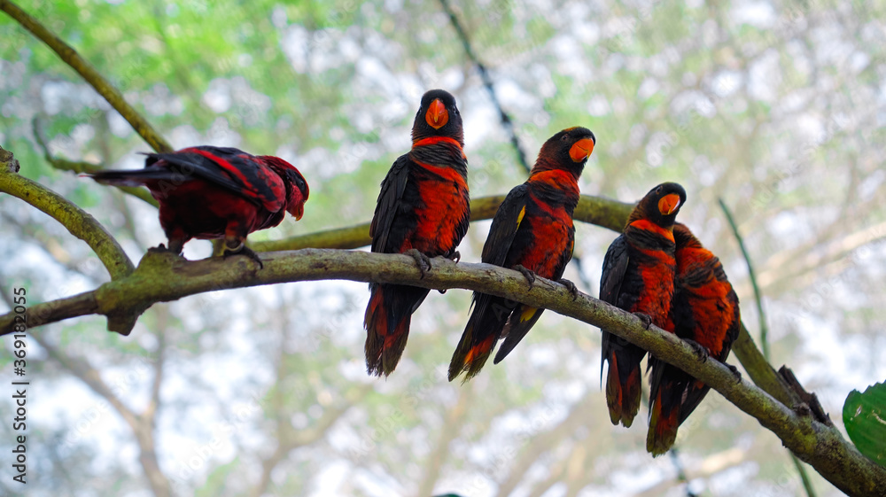 Samolepka Group of parrots lory with blue and black feathers in the usual habitat in the f
