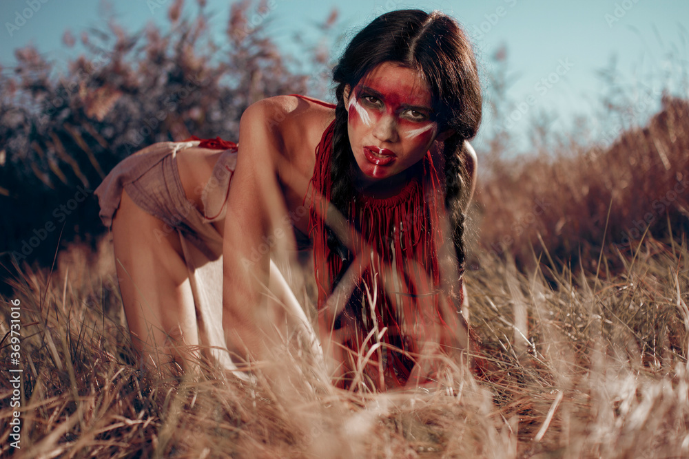 Samolepka red-skinned Indian girl with red makeup on her face posing in yellow grass