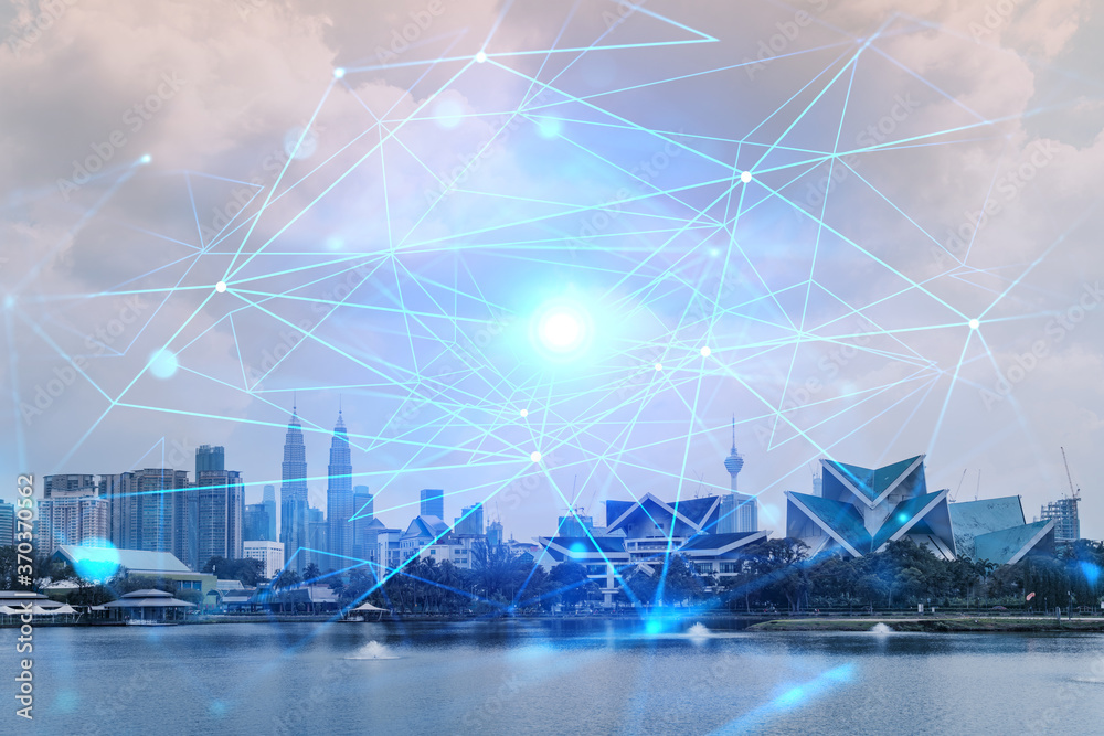 Samolepka Abstract technology icons hologram over panorama city view of Kuala Lumpur, Malaysia, Asia
