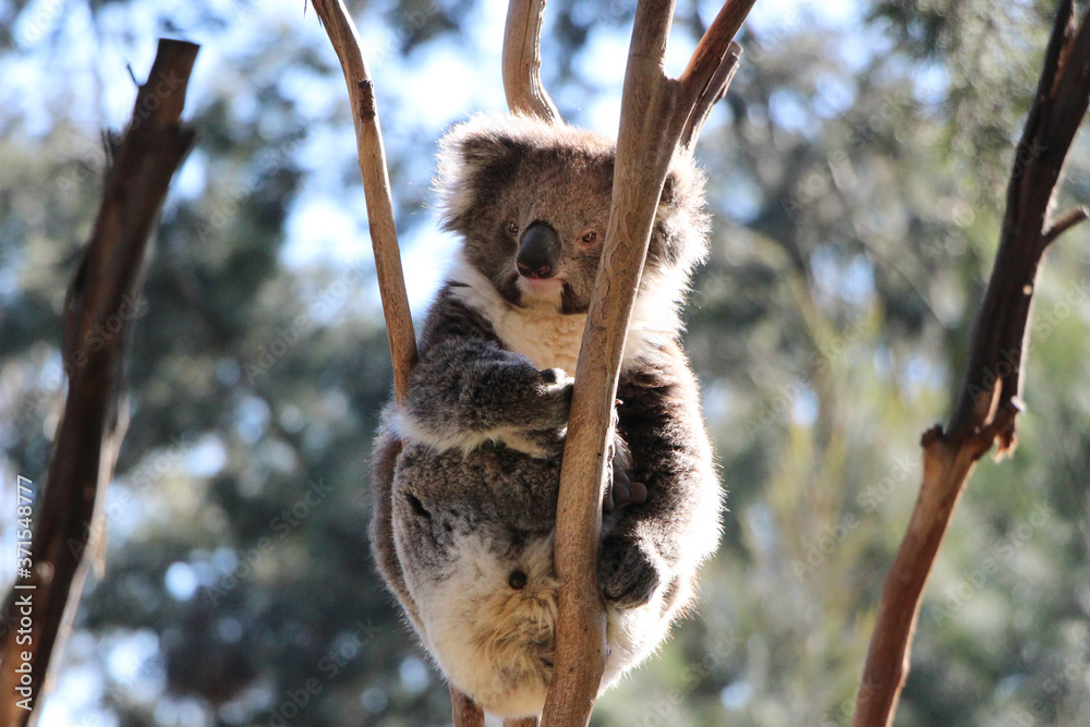 Samolepka Koala bear sits in the crook of a tree branch, watching the world go by