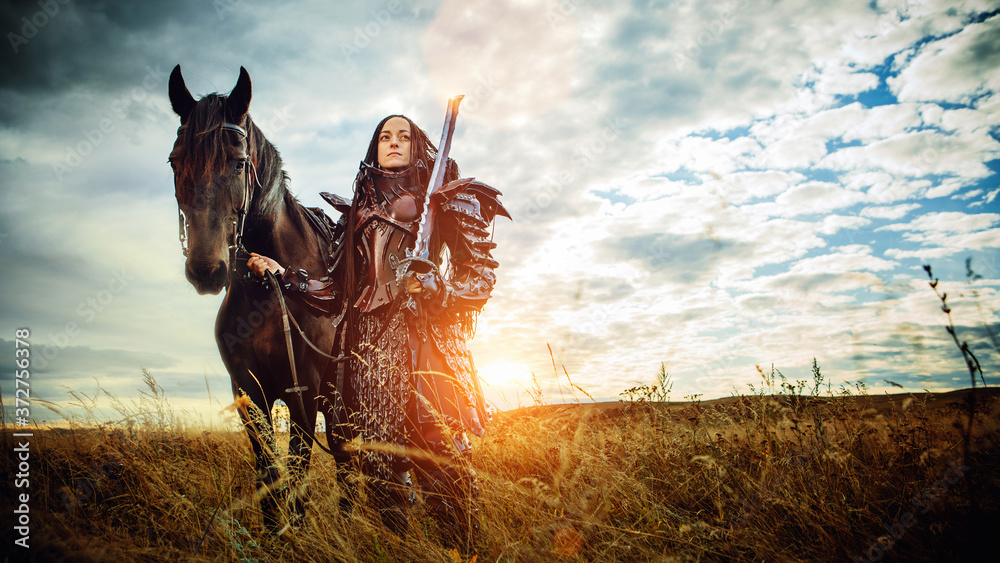Samolepka Girl in medieval knight's armor with a horse against the sunset fields backgroun