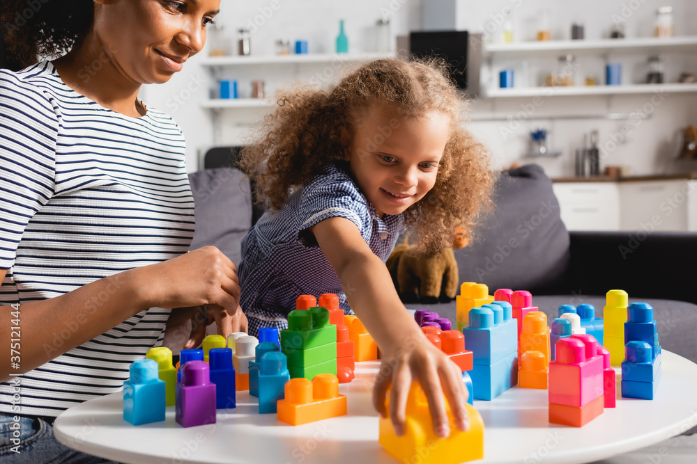 Samolepka selective focus of african american girl taking building block while playing tog