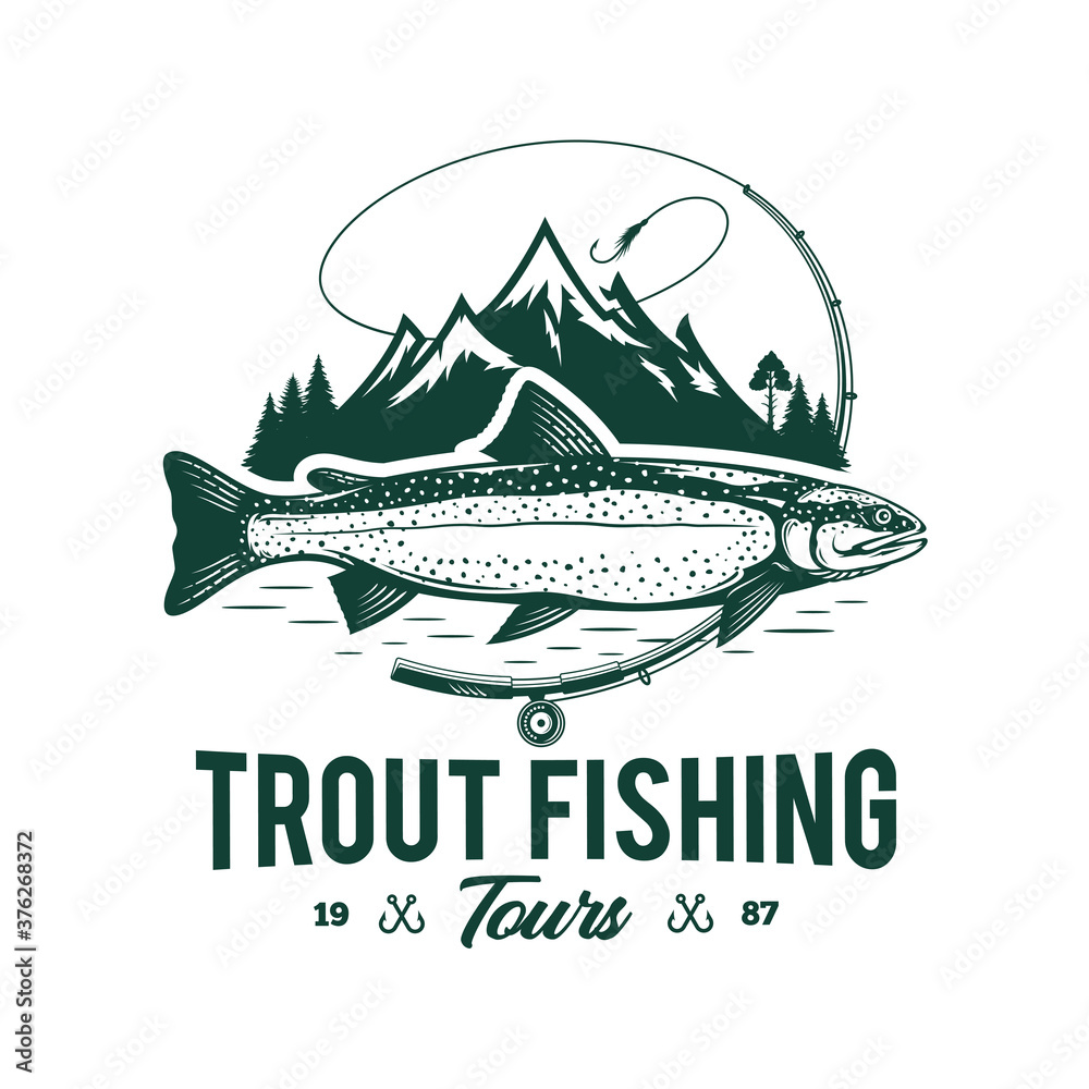 Samolepka Vector fishing logo with trout fish, fishing rod, line, hook, and mountains