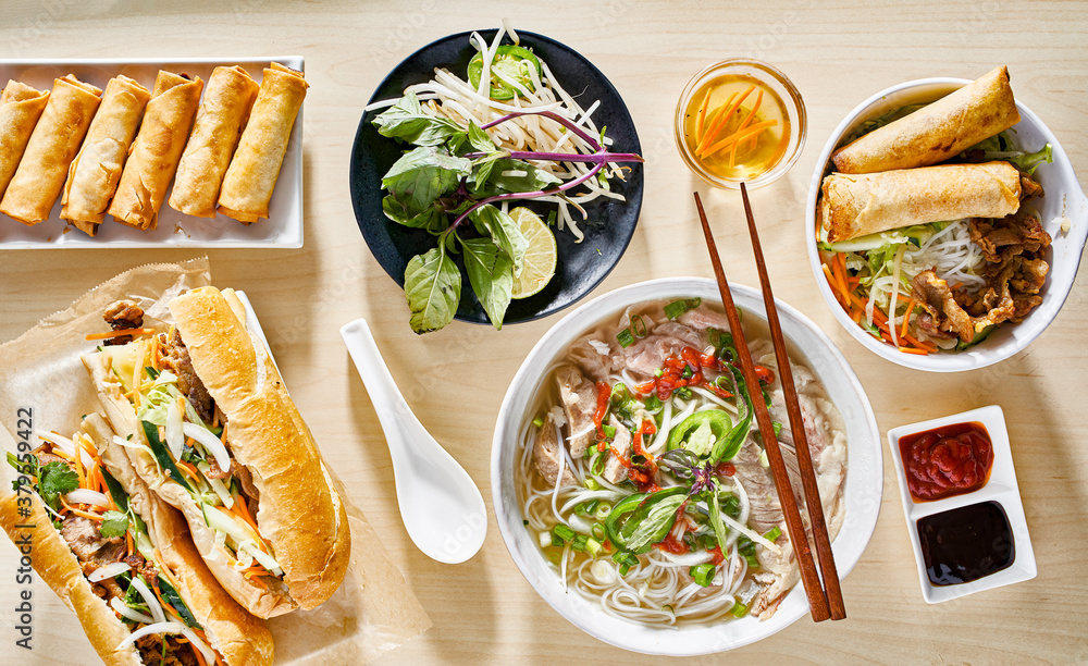 Samolepka assorted vietnamese dishes with pho, bahn mi, spring rolls in top down compositi