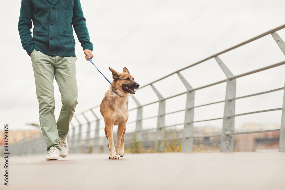 Samolepka Close-up of man walking with his German shepherd on a leash along the bridge in
