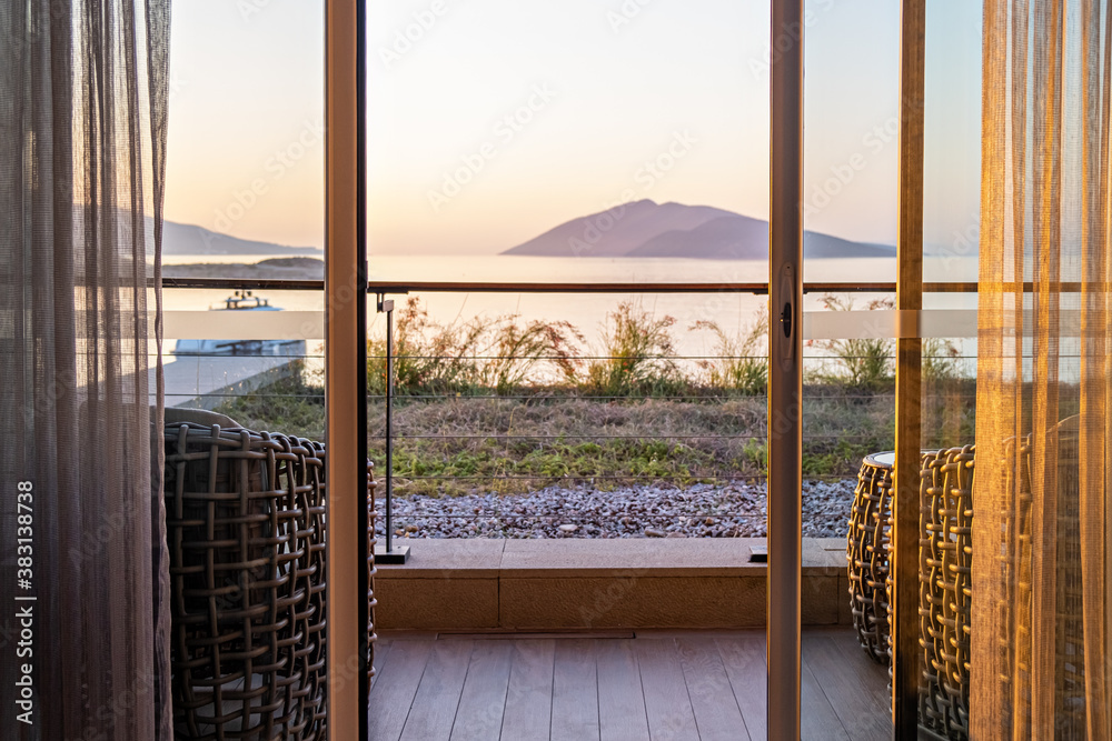 Samolepka Hotel room terrace balcony with a sea view The window overlooking the ocean