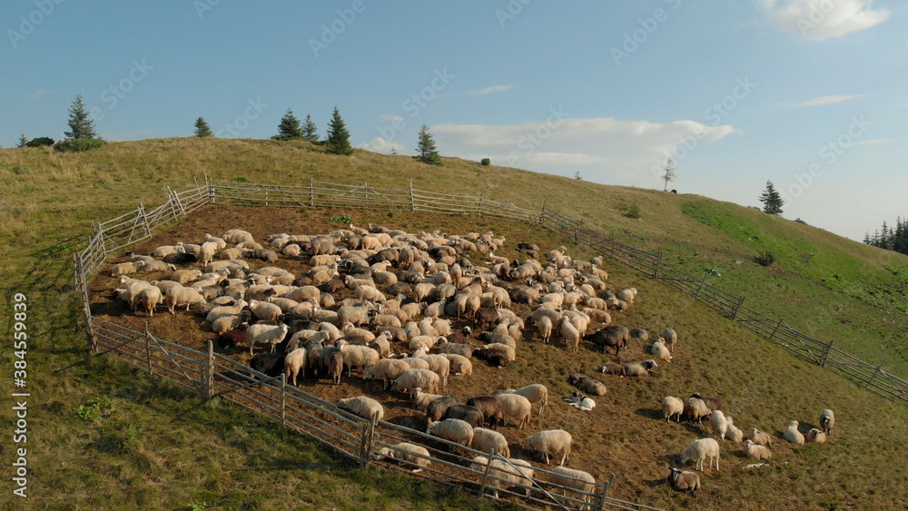 Samolepka Cute sheeps are chewing juicy grass in mountains
