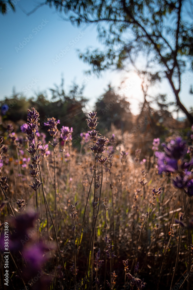 Samolepka Beautiful flowers in the autumn garden at sunrise. Levander.