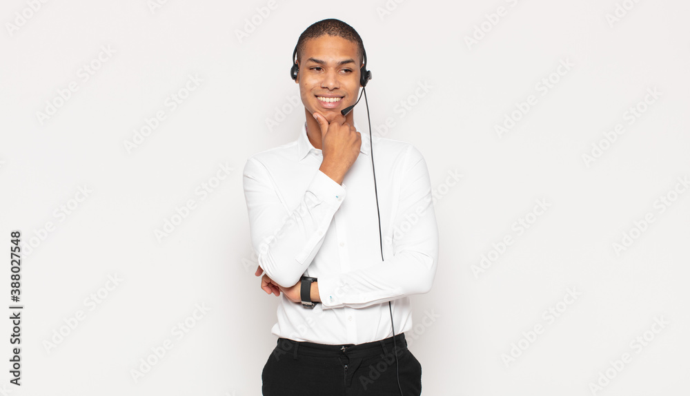 Samolepka young black man smiling with a happy, confident expression with hand on chin, wo