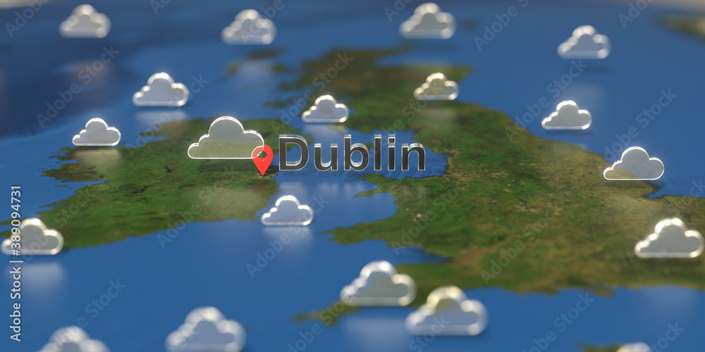 Samolepka Dublin city and cloudy weather icon on the map, weather forecast related 3D rend