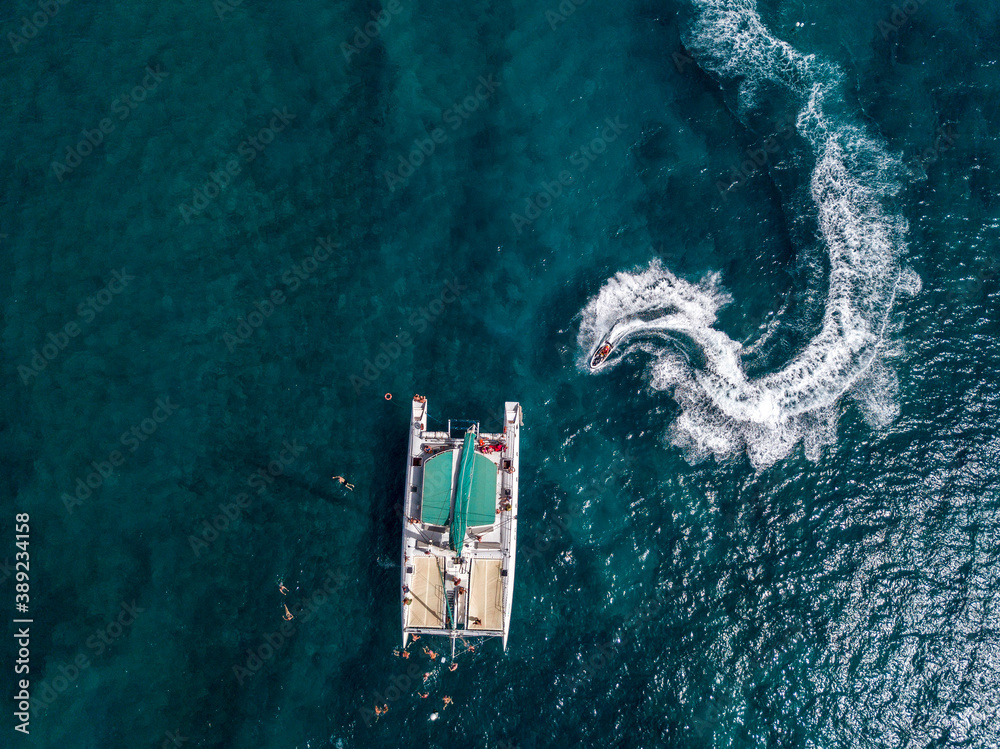 Samolepka Aerial view of a catamaran with person on board and in the sea swimming, near the coasts of the island of Lanzarote, Canary, Spain