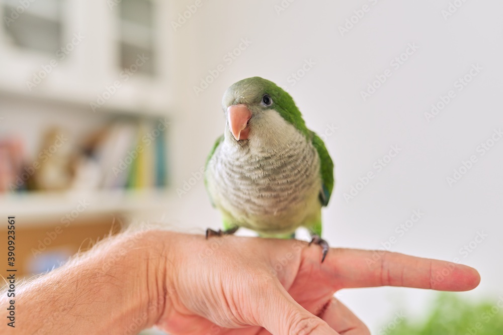Samolepka Young green parrot chick quaker on a man's hand at home