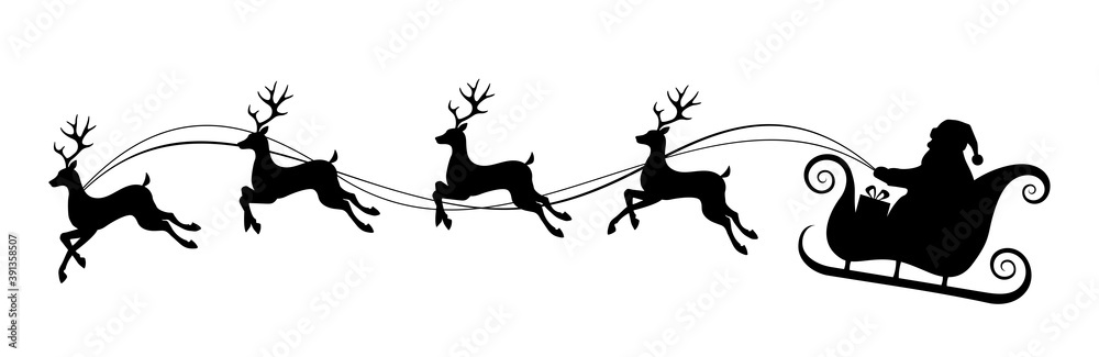 Samolepka Vector Christmas black and white illustration with Santa Claus riding his sleigh pulled by reindeers