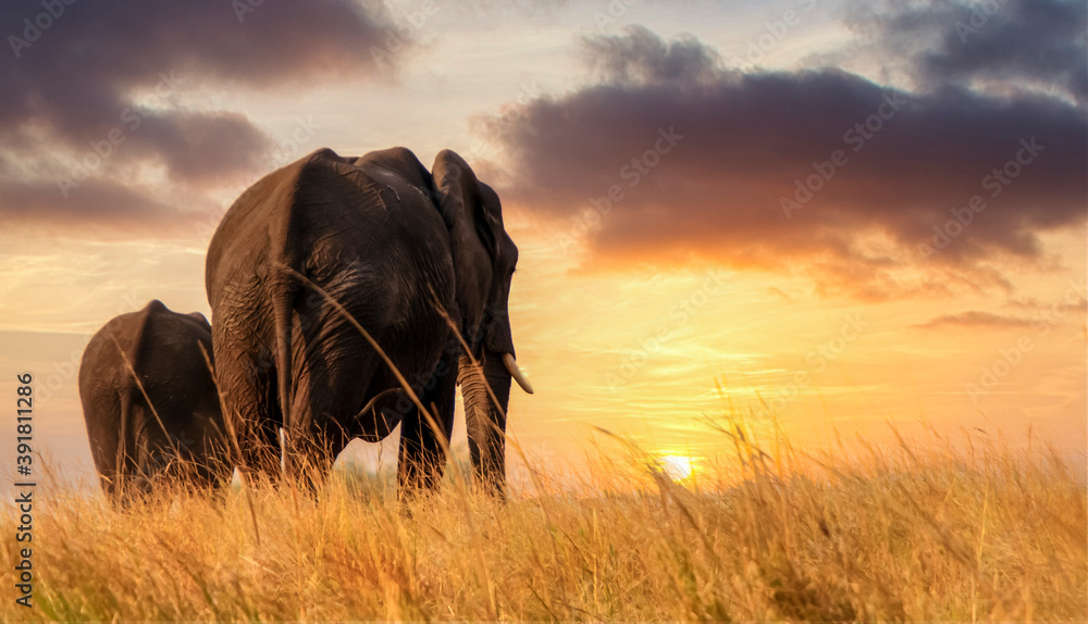 Samolepka Elephants overlooking Sunset along Chobe River, Botswana