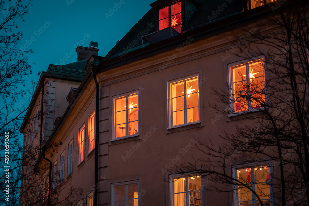 Samolepka Building in Stockholm decorated with yellow light lantern