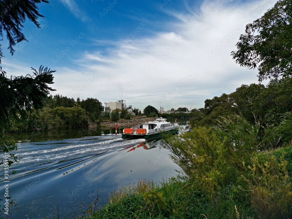 Samolepka Beautiful view of a river with reflections trees, deep blue sky and light clouds