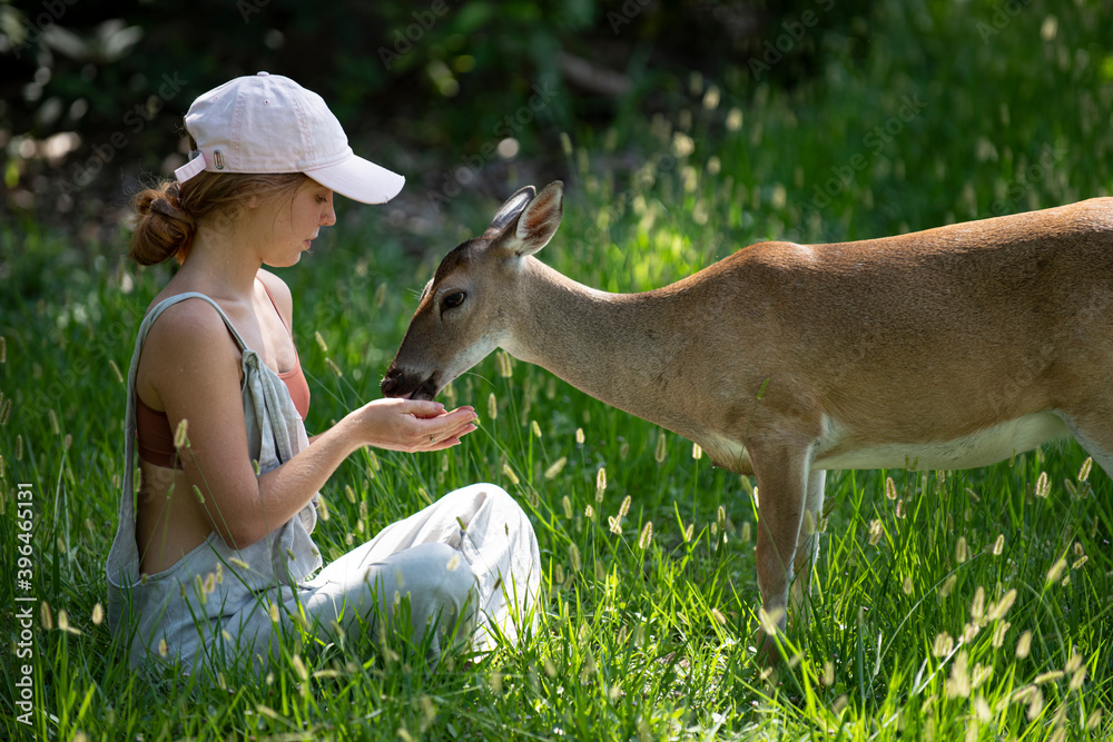 Samolepka Young woman feed deers bambi. Cute wild animals concept.
