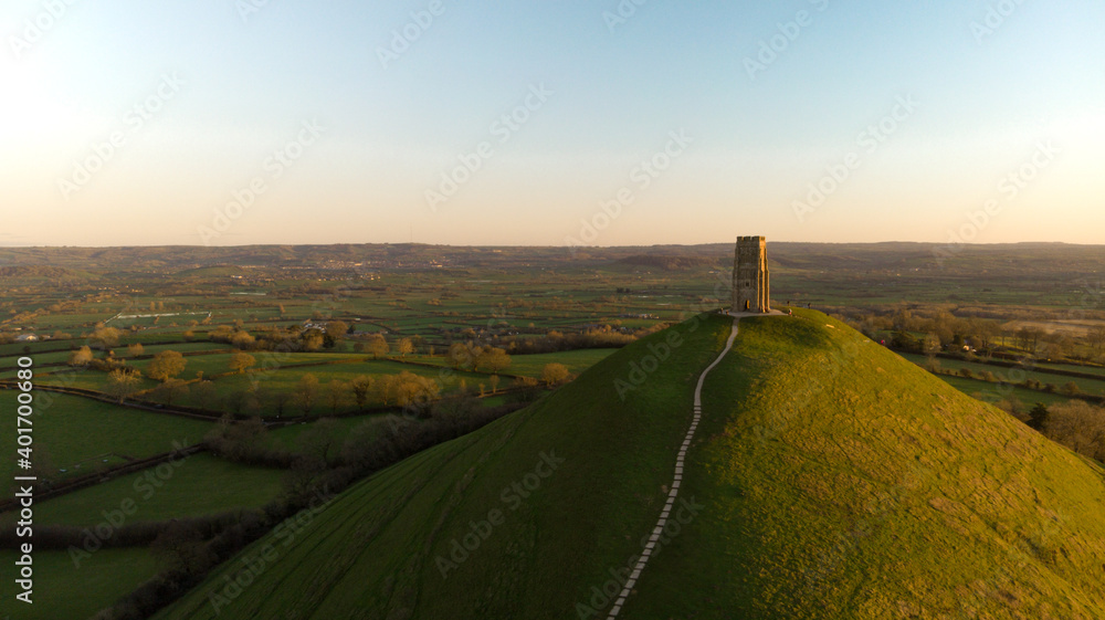Samolepka Aerial view of the early morning sunrise over Glastonbury Tor with Somerset fields below
