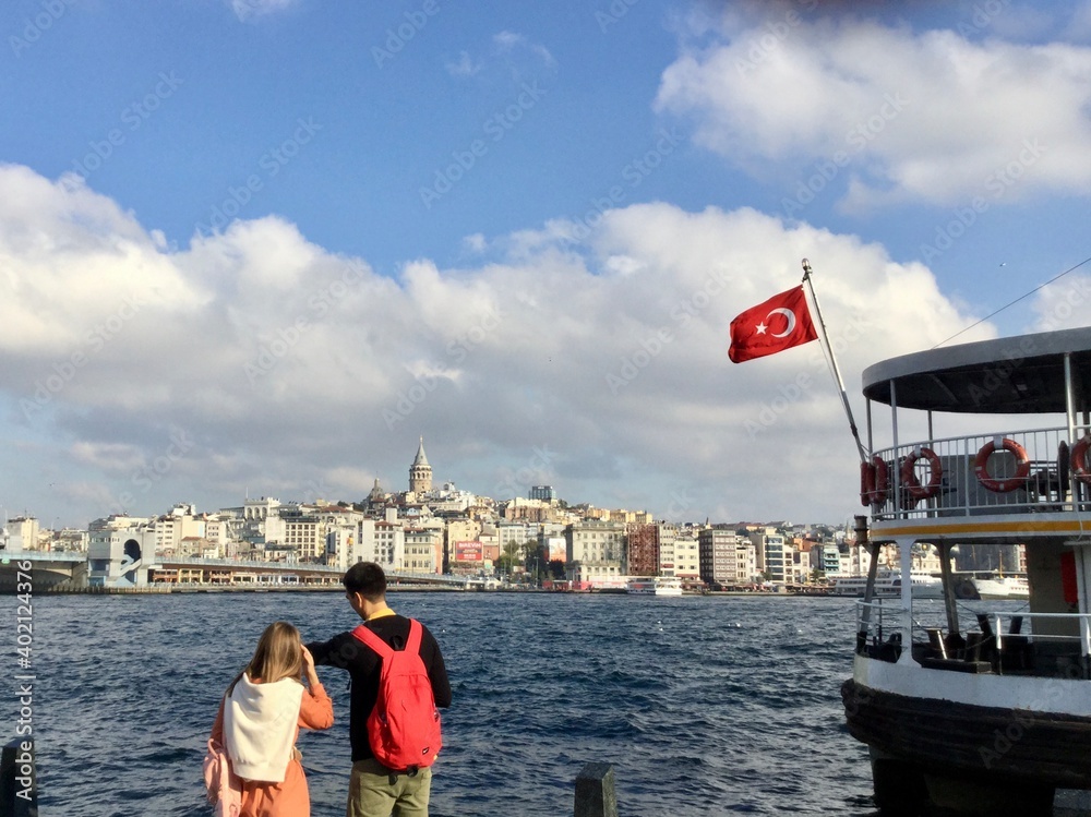 Samolepka Young couple on beach looking at the Golden Horn in Istanbul with ferry and distance view of Galata bridge and tower