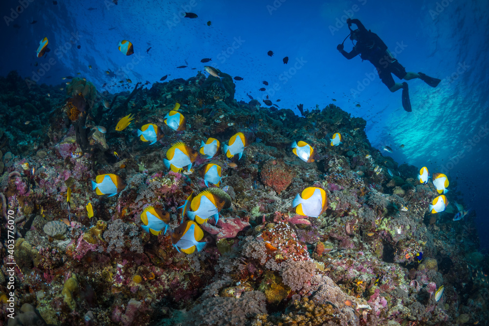 Samolepka Tropical fish swimming aboce coral reef in Papua New guinea