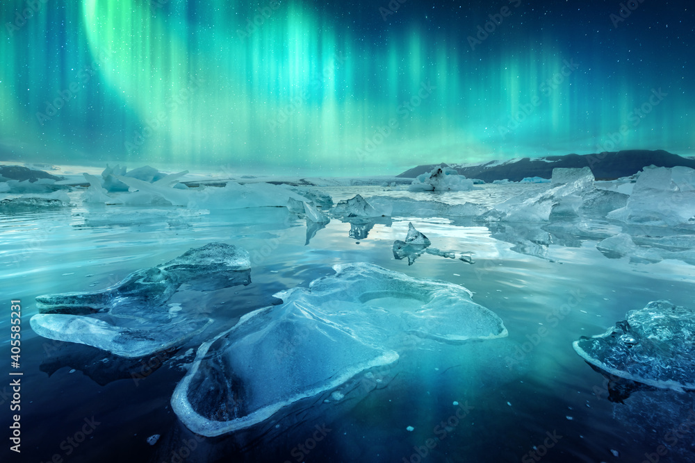 Samolepka Aurora borealis northen light and icebergs in Jokulsarlon glacial lagoon