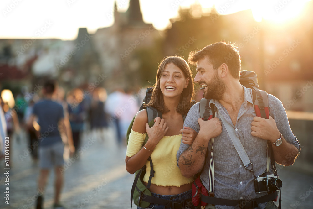 Samolepka Happy tourist couple sightseeing; Traveller lifestyle