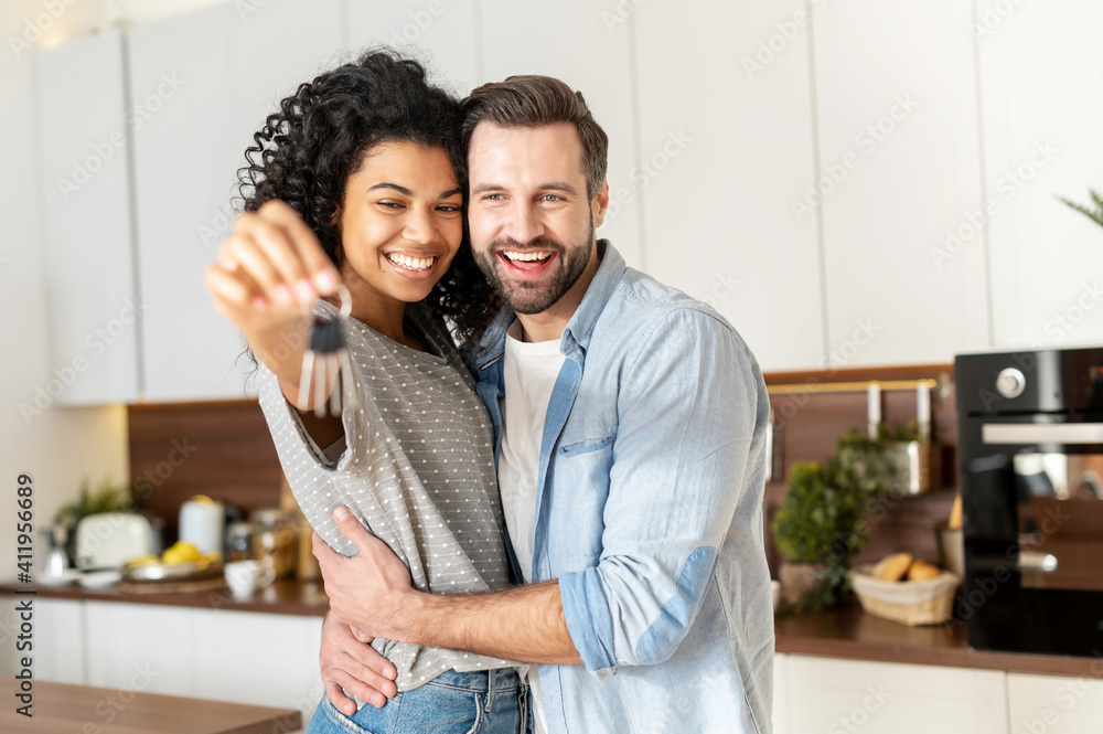 Samolepka Young interracial married couple smiling cheerfully and showing keys from a new