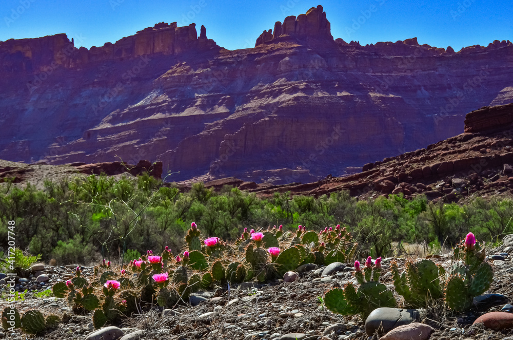 Samolepka Flowering cactus plants, Pink flowers of Opuntia polyacantha in Canyonlands Nati