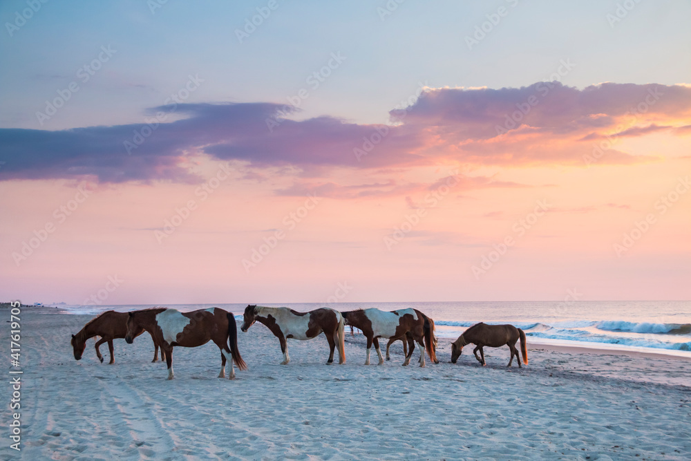 Samolepka feral horses on Assateague beach in a early morning summer sunrise